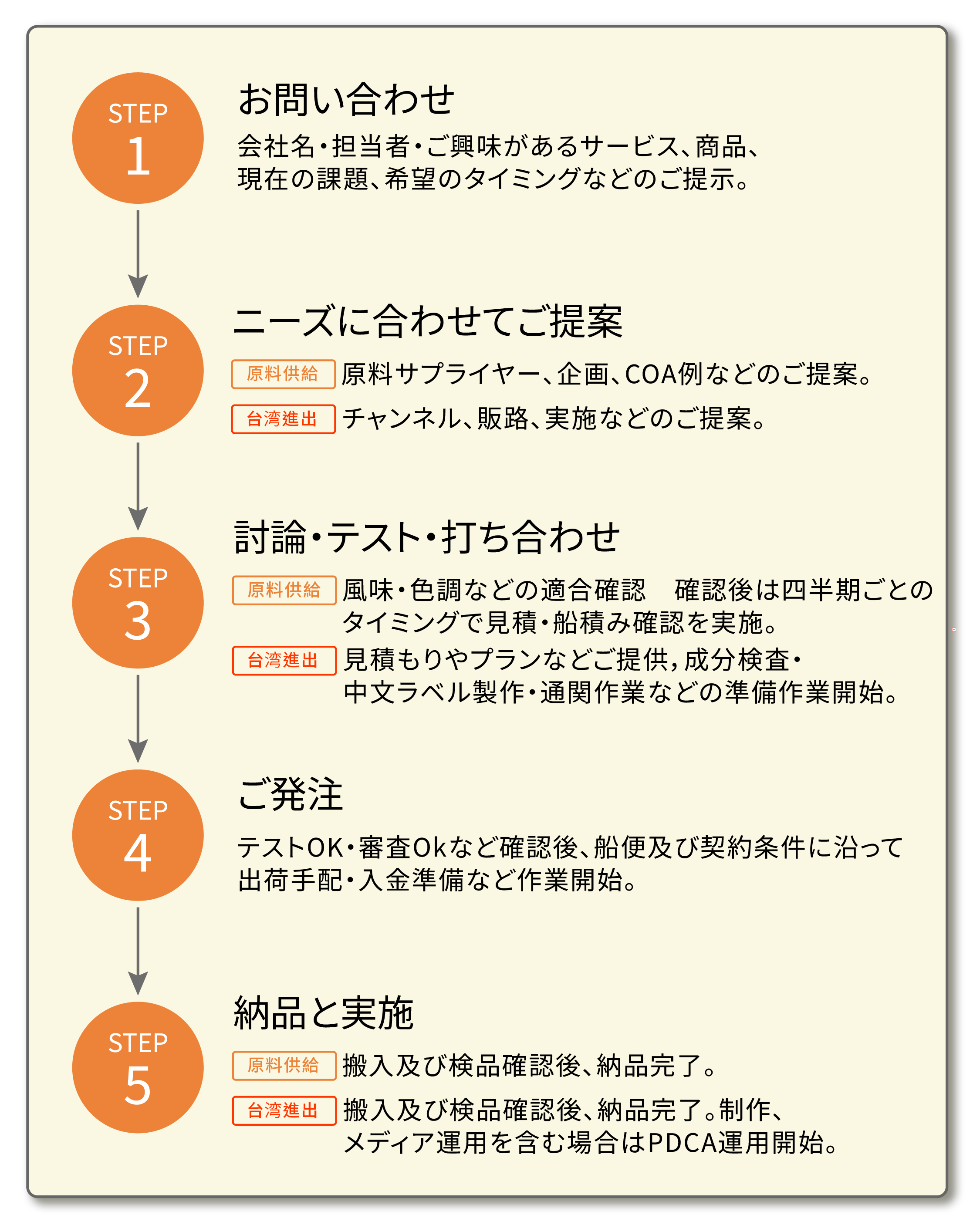 日本との連携を通じて、グローバルで安価な原料と商品開発技術を、台湾で事業展開されるOEMメーカー様やブランド企業様に提供します。